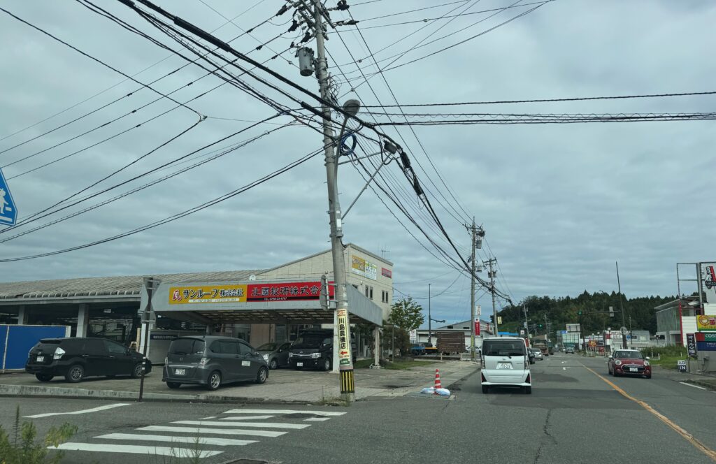 能越道を降りて輪島市内に入ったところでも電柱などは傾いたままの状態でした。